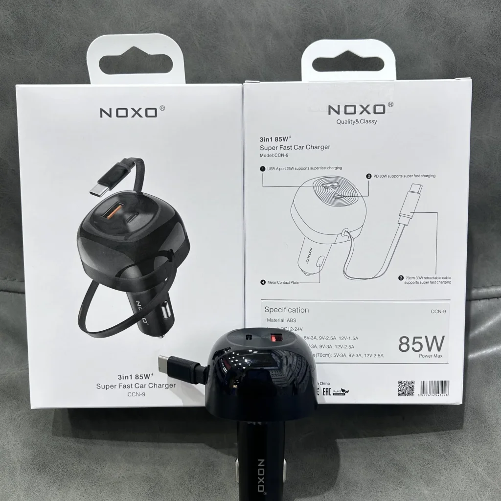 شارژر فندکی نوکسو مدل CCN‑9 | توان 85 وات | PD + QC4.0 | کابل جمعشونده USB‑C