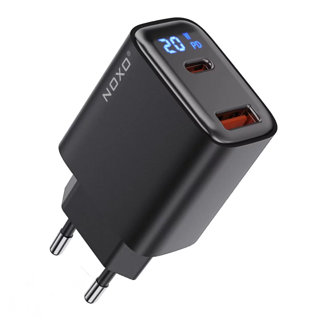 شارژر دیواری ۲۰ وات نوکسو مدل CHN-6 با ۲ پورت USB-A + USB-C، پشتیبانی PD و QC3.0 و نمایشگر دیجیتال (EU Pin)