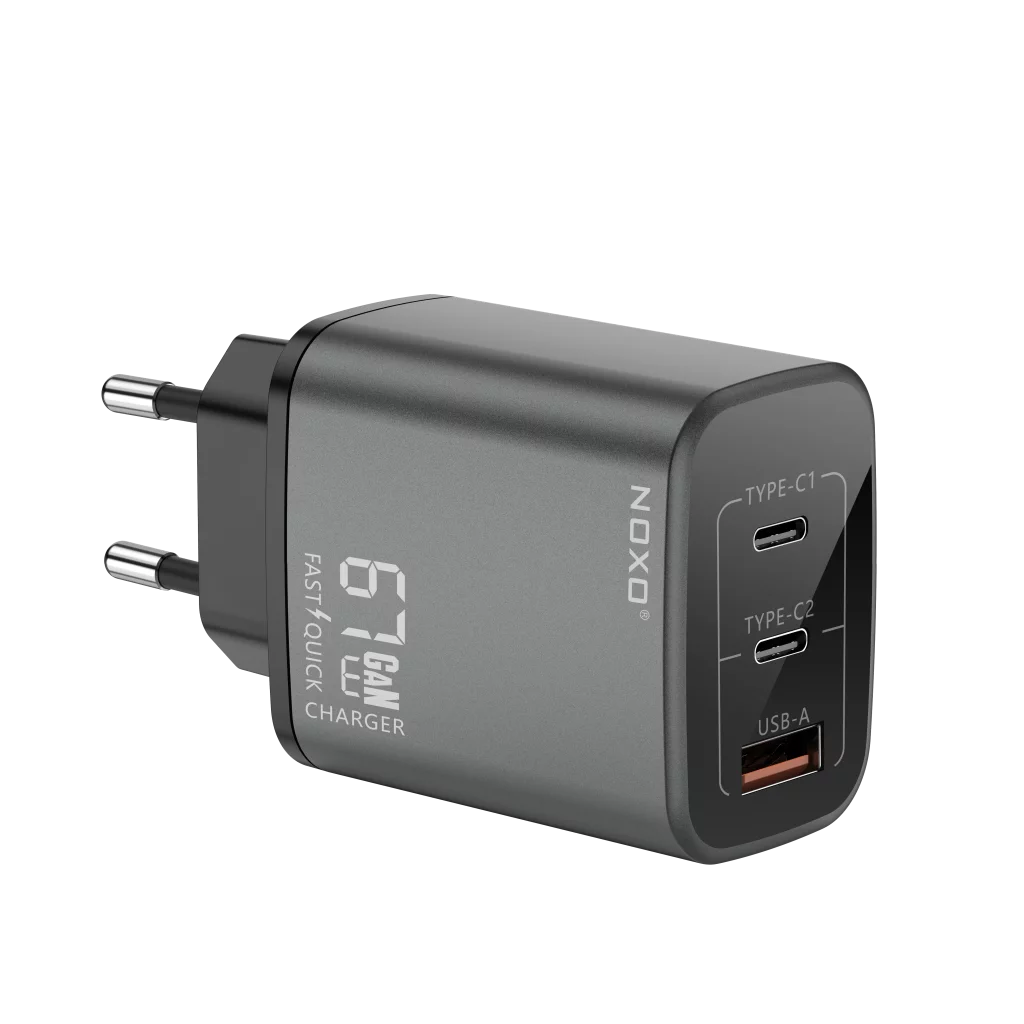 شارژر دیواری ۶۷ وات نوکسو مدل CHN-P-2 با فناوری GaN طراحی شده تا توان بالا را در ابعادی کوچک و سبک ارائه دهد. این شارژر با داشتن سه پورت خروجی (دو پورت Type-C و یک پورت USB-A) به شما امکان میدهد چند دستگاه را بهطور همزمان شارژ کنید بدون اینکه از سرعت یا کیفیت شارژ کاسته شود.
