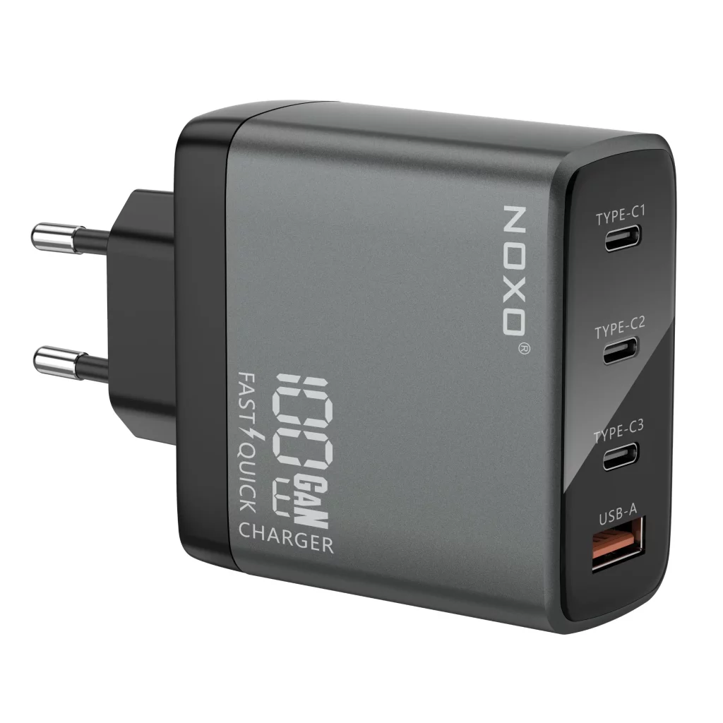 شارژر دیواری ۱۰۰ وات نوکسو مدل CHN-P-3 با فناوری GaN طراحی شده تا توان بالا را در ابعادی کوچک و سبک ارائه دهد. این شارژر با داشتن چهار پورت خروجی (Type-C1، Type-C2، Type-C3 و USB-A) امکان شارژ همزمان چند دستگاه را فراهم میکند بدون کاهش سرعت یا کیفیت شارژ.