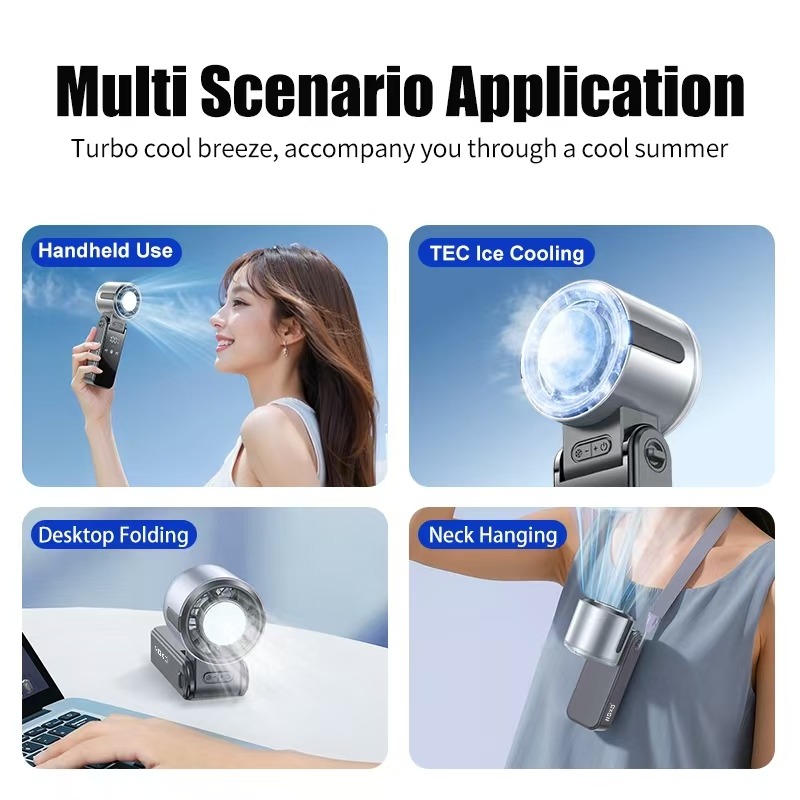 | قابلیتهای پنکه | طراحی تاشو و قابل حمل / نمایشگر دیجیتال بزرگ / خنککنندگی TEC Ice Cooling / طراحی دو کاناله جریان هوا (Inner & Outer Air Duct) / توربوفن پرقدرت با باد بسیار قوی / حداکثر سرعت چرخش 29,000 دور در دقیقه / صدای حداکثر 75dB / مناسب استفاده در سناریوهای مختلف (دستی، رومیزی، گردنی) |