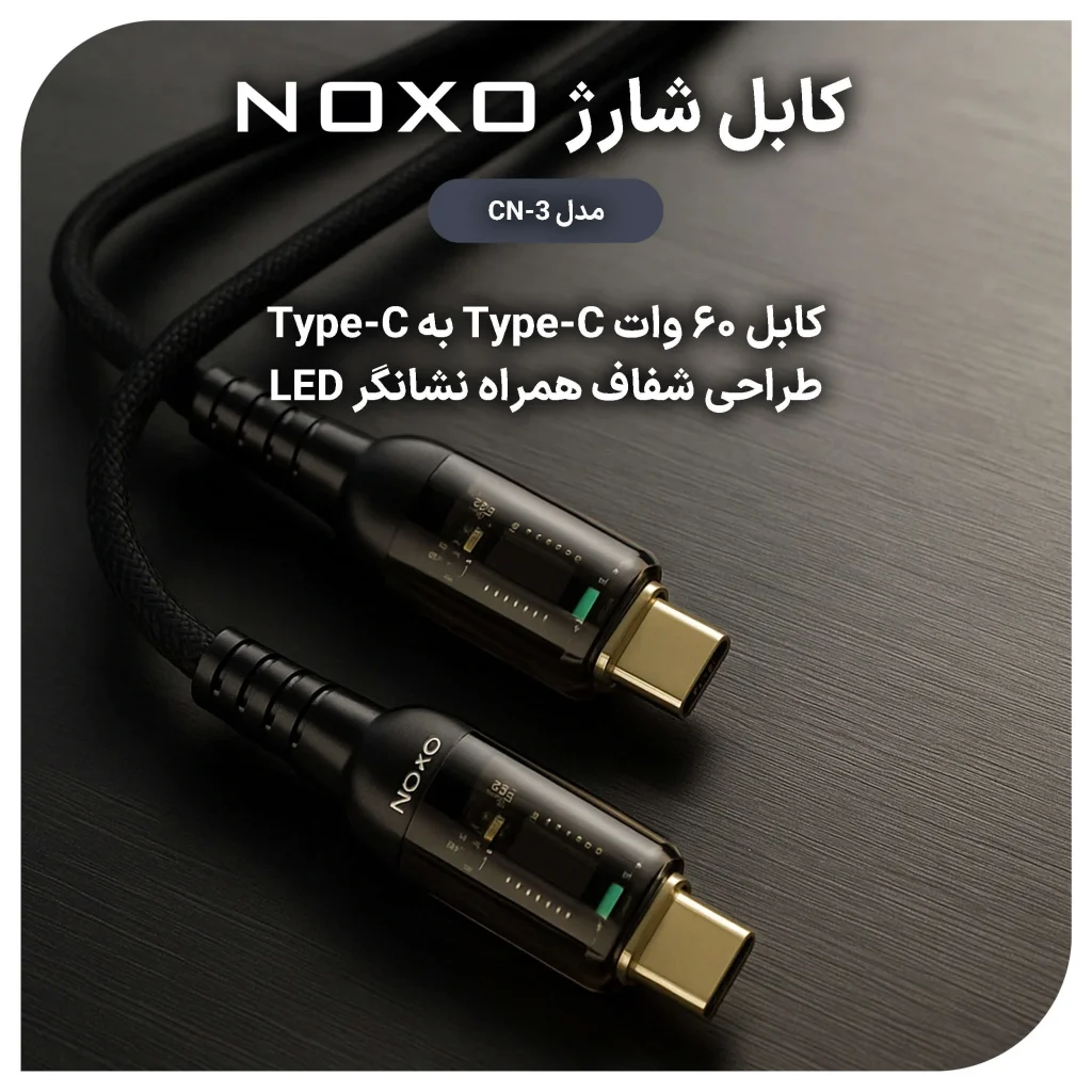 کابل Type-C به Type-C نوکسو مدل CN-3 با طول ۱.۲ متر، بدنه ترکیبی TPE و شفاف، طراحی مقاوم و پشتیبانی از شارژ سریع تا 60 وات و انتقال داده ایمن، گزینهای حرفهای و قابل اعتماد برای دستگاههای USB-C است.