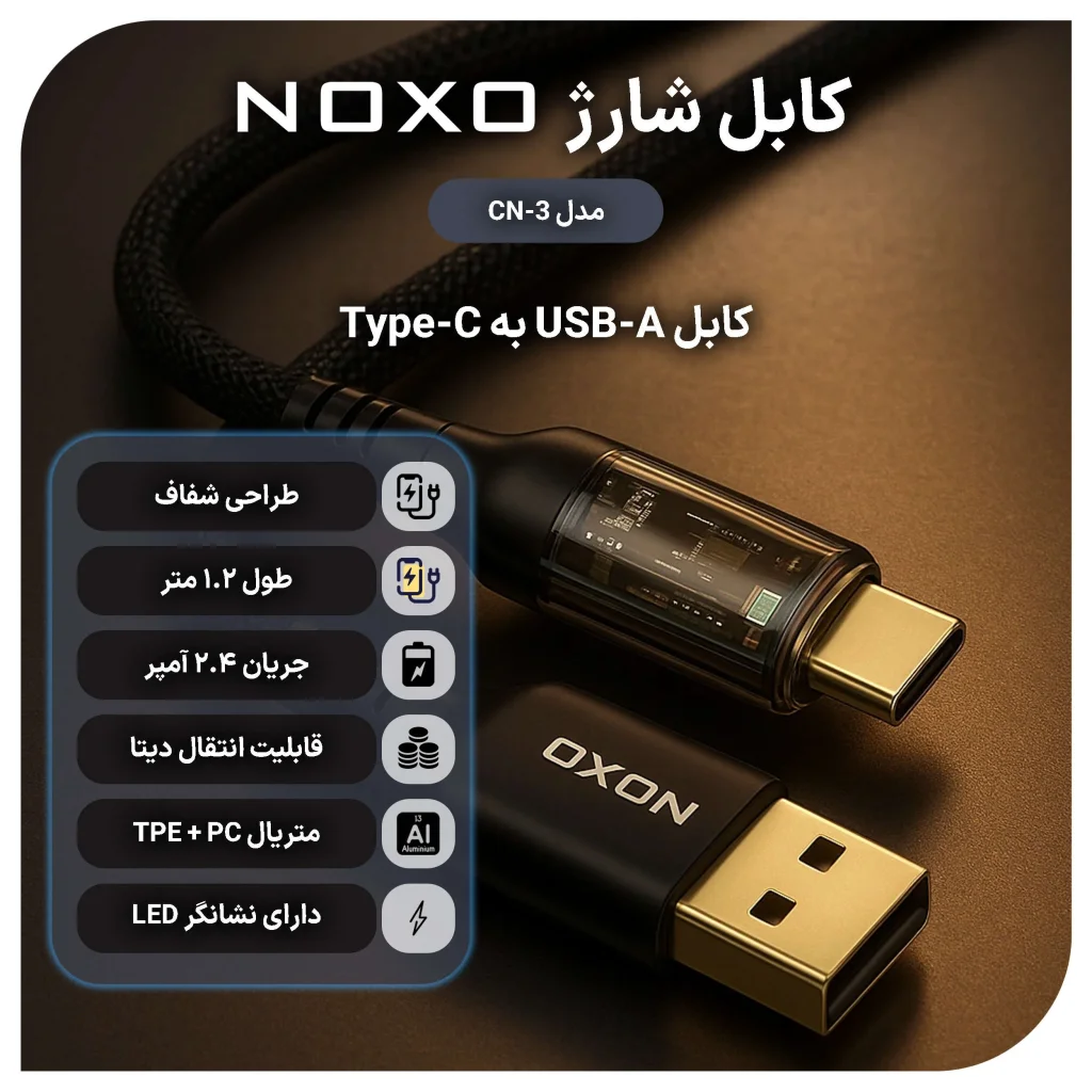 کابل USB-A به Type-C نوکسو مدل CN-3 با طول ۱.۲ متر، بدنه ترکیبی TPE و شفاف، طراحی مقاوم و پشتیبانی از شارژ سریع تا ۳۰ وات و انتقال داده امن، گزینهای حرفهای و قابل اعتماد است.